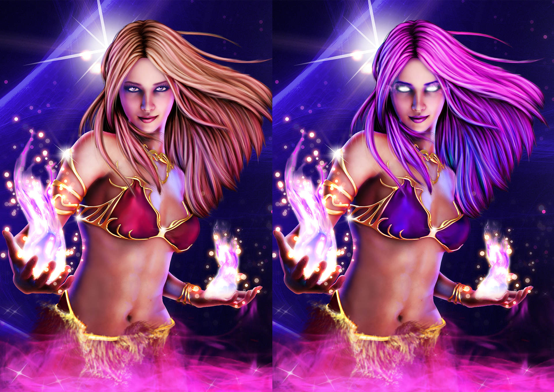 Here are a few samples of the 3D character I did for the game "Wish Mistress" as well as a few of the symbols. Gustavo Estevez did the fire effect, the smoke effect, and some of the outfit design.
